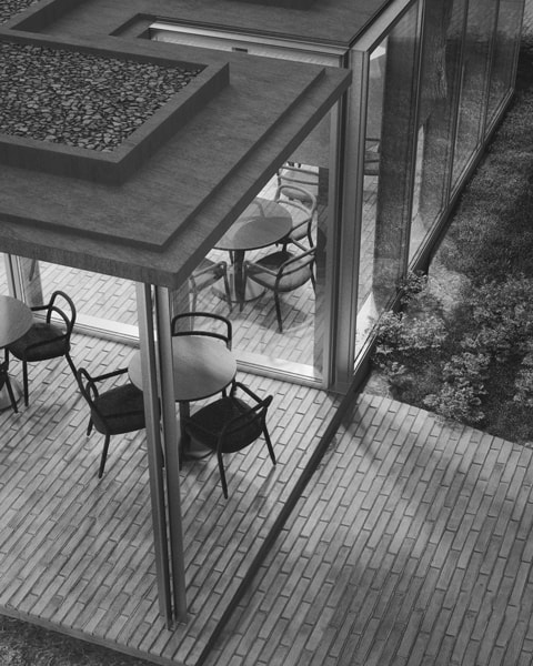 The activities intended for the annexed building are organized based on a clear compositional and structural determination. Two lines of pillars organize three naves within the polygon determined by the constraints described above – a polygon that is the result of a particular encounter between the pragmatism of applying the obligatory setbacks and idiosyncratic gestures arising from negotiating with the trees and accommodating the program. The reception, bistro, and exhibition room occupy the sector that relates directly to the garden and the Casa da Feitoria and have rich visual relationships with each other and with this immediate context, with emphasis on the water as a focal point. The exhibition room has a ceiling height of 4 meters by including a slight downward ramp, thus preventing the volume of the annex from standing out too much in the landscape. Also a key element in this section, the walkway takes on subtle curves and seeks to touch the House with just a fraction of an edge.