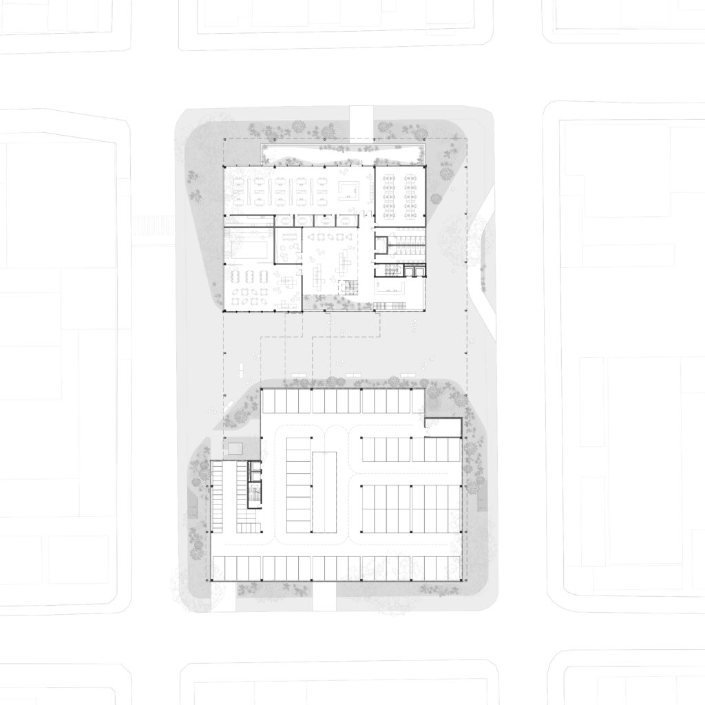 The structural solution prioritizes reinforced concrete due to local availability, skilled labor, and its balance between economy and robustness. A regular structural grid of 10.0 × 10.5 meters rationalizes beams, columns, and foundations. Ribbed slabs are employed to span longer distances while maintaining compactness. Materiality seeks territorial coherence and performance: sawn timber, widely available in the region, is adopted as the primary cladding material. In the parking areas, timber slatted panels arranged in a square grid ensure cross-ventilation and solar protection; on the roof, the same grid modulates light and shadow, reinforcing architectural continuity.