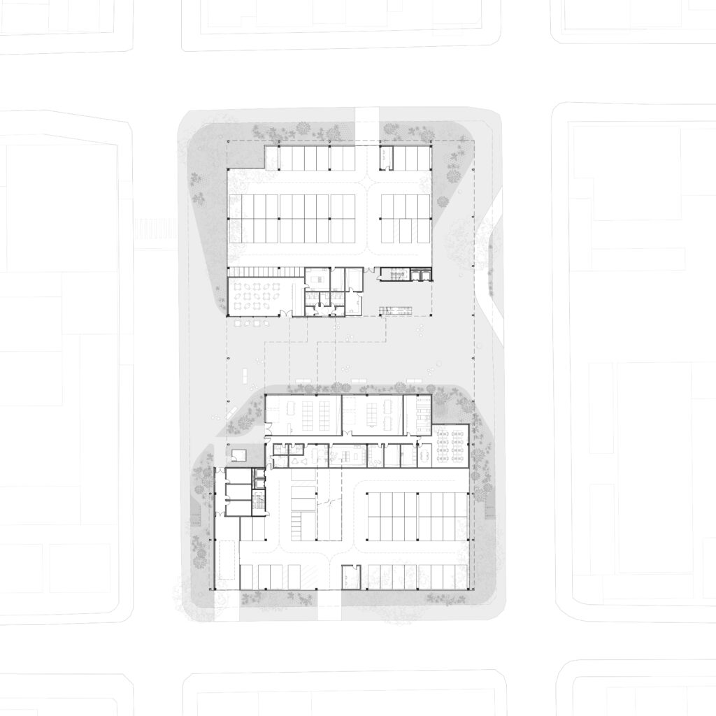 The program is organized according to functional affinities, encouraging intuitive circulation. The building is open and adaptable: balconies, courtyards, and voids form democratic arenas for gathering and spaces for exchange. These voids also operate as passive comfort strategies, providing shading, thermal dissipation, and cross-ventilation guided by the prevailing southern winds. The walkways connecting the blocks function as extensions of the social areas, enhancing circulation quality and reinforcing integration. Social staircases expand movement alternatives and strengthen spatial continuity between floors.
